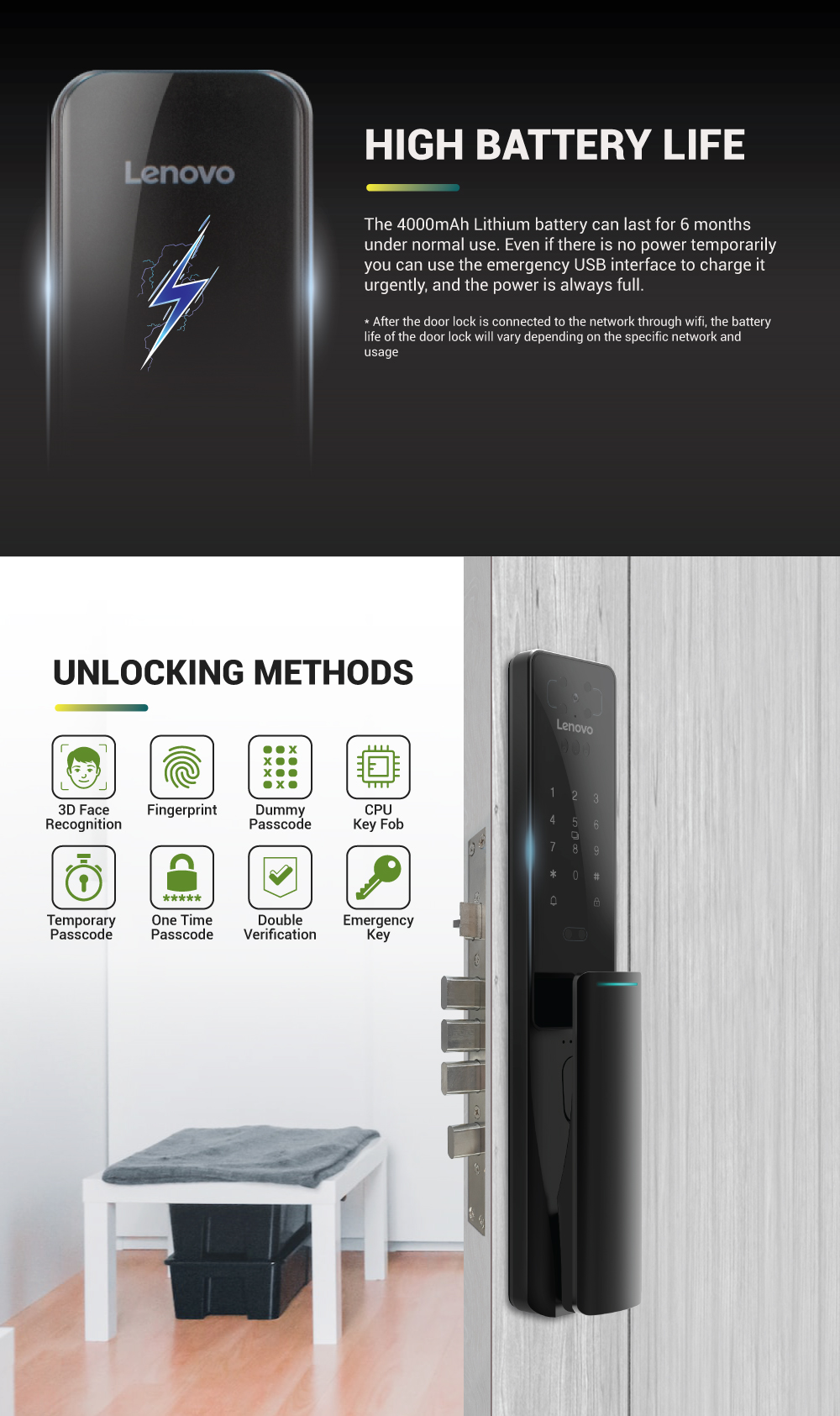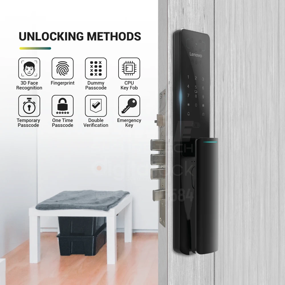 Unlock Method : 3D Face Recognition / Fingerprint /Password / Dynamic Password / Mechanical Key / Card